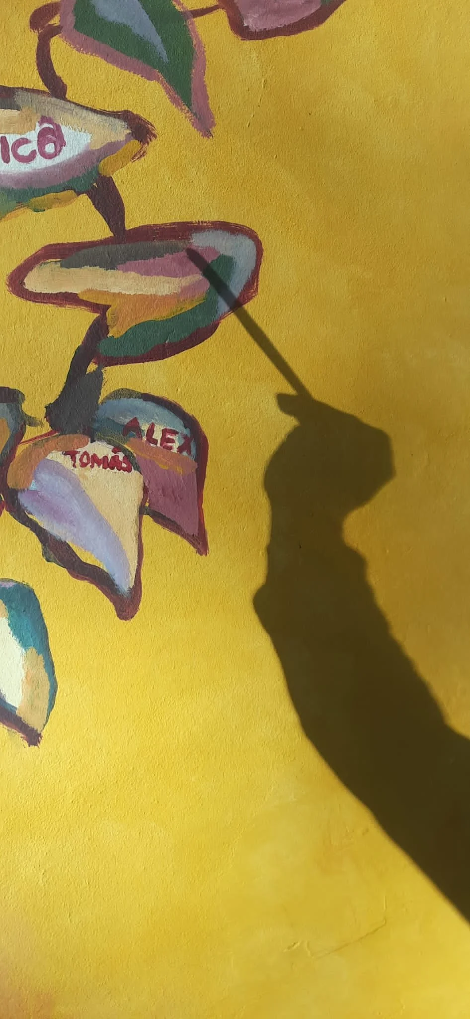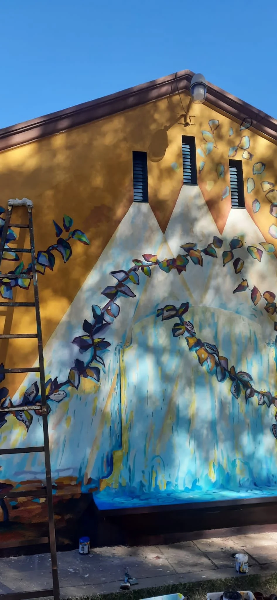 The image was built on to two existing wall features: three little windows at the top of the wall and a bench for students. The windows have been transformed into the teatrical lights, with colour that spills out of them also giving the impression of light or water sources, while the bench has become a fountain. As the scraper reaches the top of the image, the leaves detach into space, floating across the landscape.