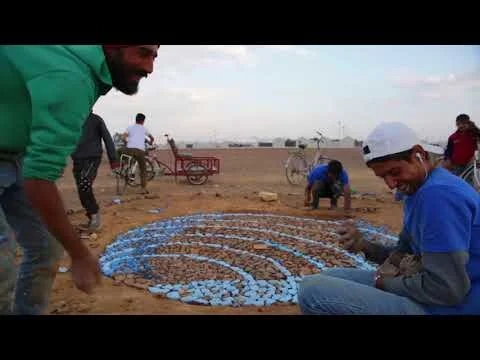 Patricio formed a team of ‘Change Makers’ with volunteers, and collaborated with two Syrian artists working in the camp, Samir and Abu Abdallah. Together they developed a new technique to create sustainable ‘Azraq Mosaics’ on the ground. Their purpose is to visually enhance the long walks from village to village, creating focal points and positive change. Different groups will be engaged in the design process to increase inclusivity. Our ambition is to create over 100 mosaics and rename the zone Mosaic Park.