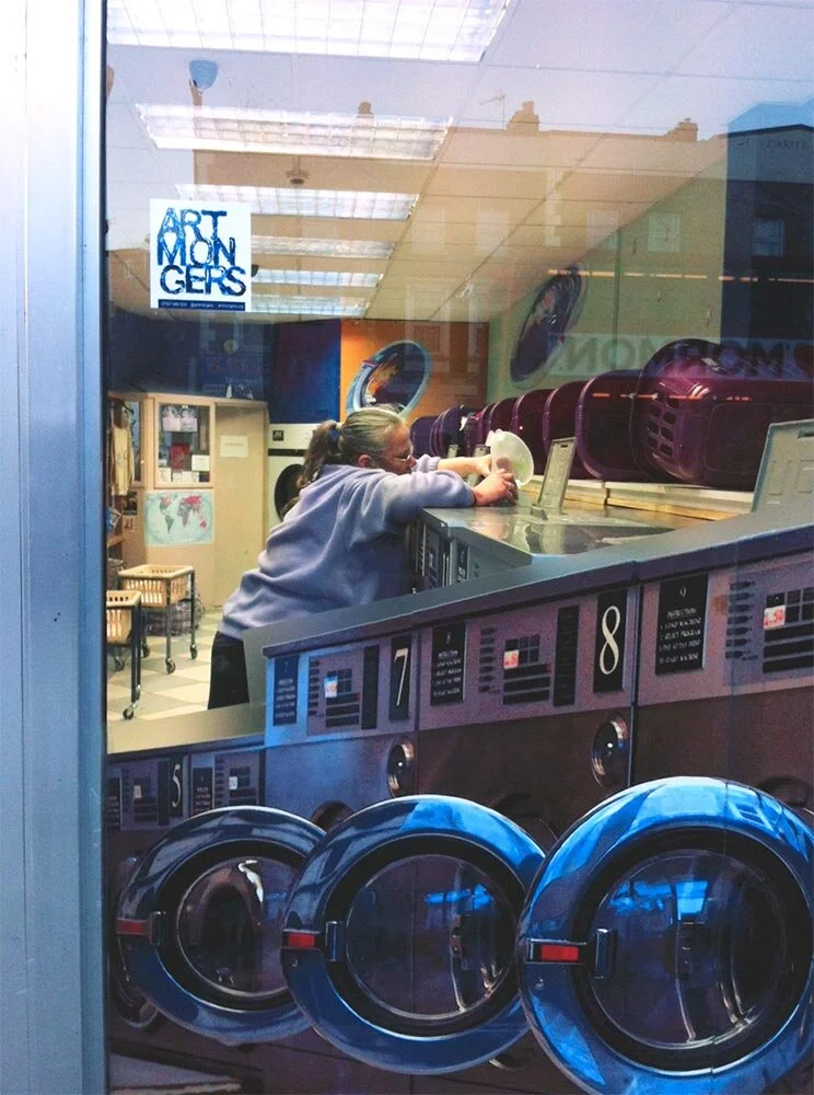 After receiving some funding from Lewisham Council, we pitched a sci-fi inspired image to the owner of the Launderette. We wanted to combat the binary nature of the washing machines’ open or shut doors with a more fluid picture. Glancing at the image as you pass by gives the impression that you’re actually in the shop — and what could be a better way of attracting customers than making them feel as if they are already inside?
