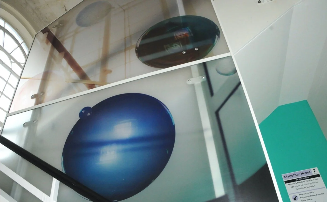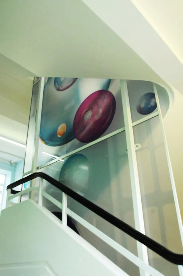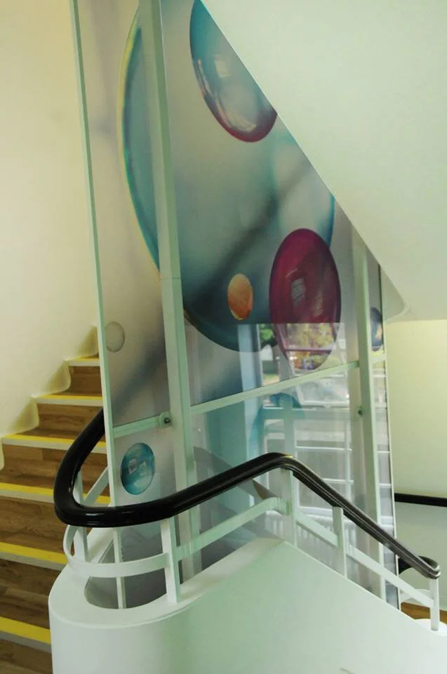 We also made an artwork for the stairs used by patients to go from their rooms to their school class. For it we created a panel decorated with bubbles which reflected and distorted the space of the stairs.