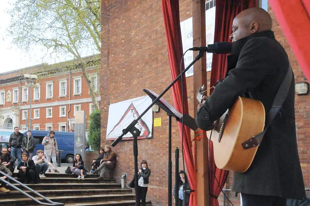 The area outside Goldsmiths Library (on Lewisham Way just by the main Goldsmiths building) is a natural gathering point, which is easily visible to bus passengers, cars, pedestrians and students. For 16 days, we gave people the perfect excuse to sit on the steps and enjoy some local culture.