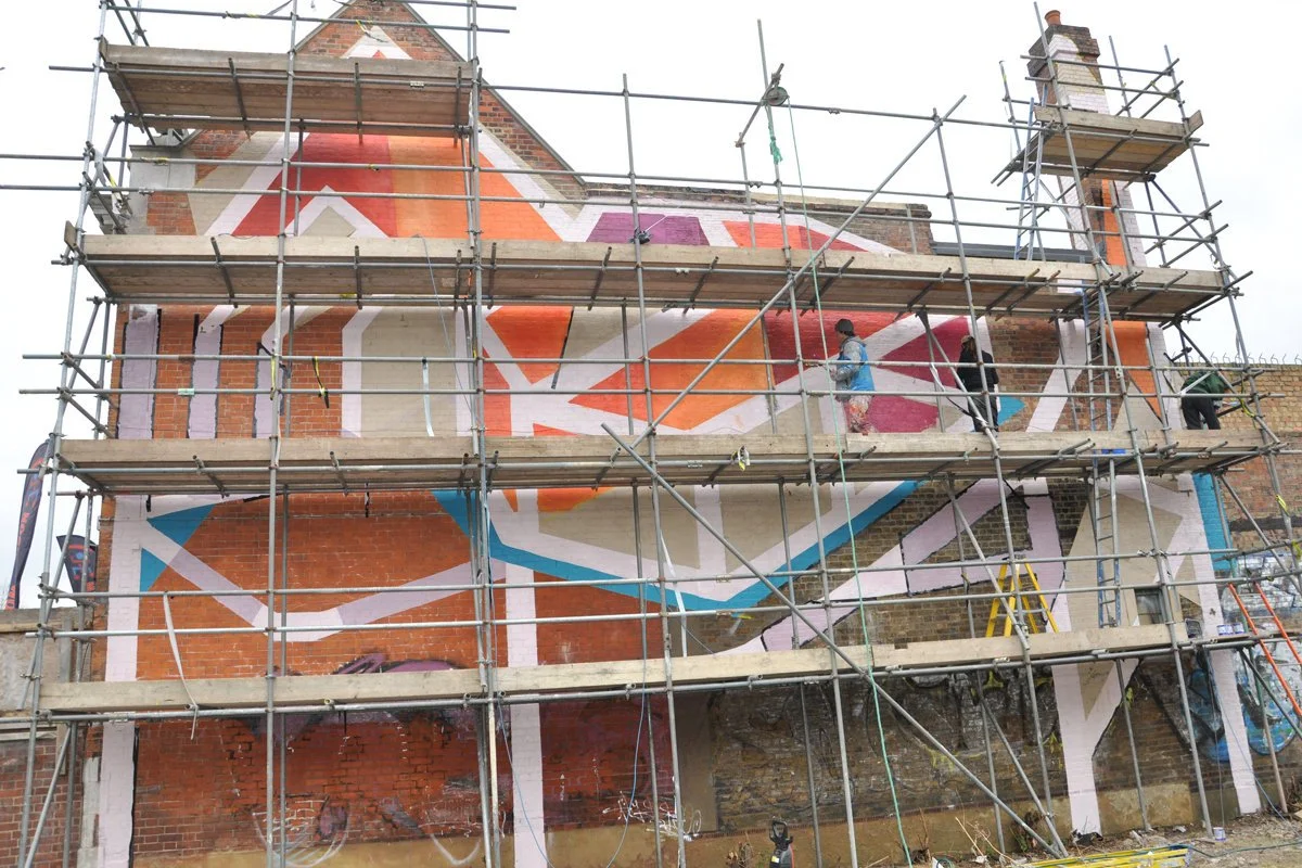 Just in front of the side wall was a stretch of construction hoarding that had become a long-term (10 years!) part of this public space. We decided that continuing the chosen design onto the streetside hoarding would create another layer of interest to the work; drawing in passersby and adding the possibility to play with changing perspectives from far away.