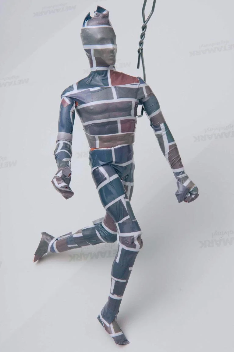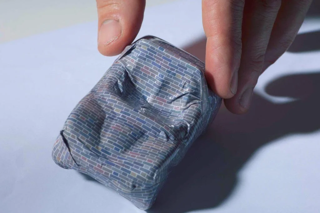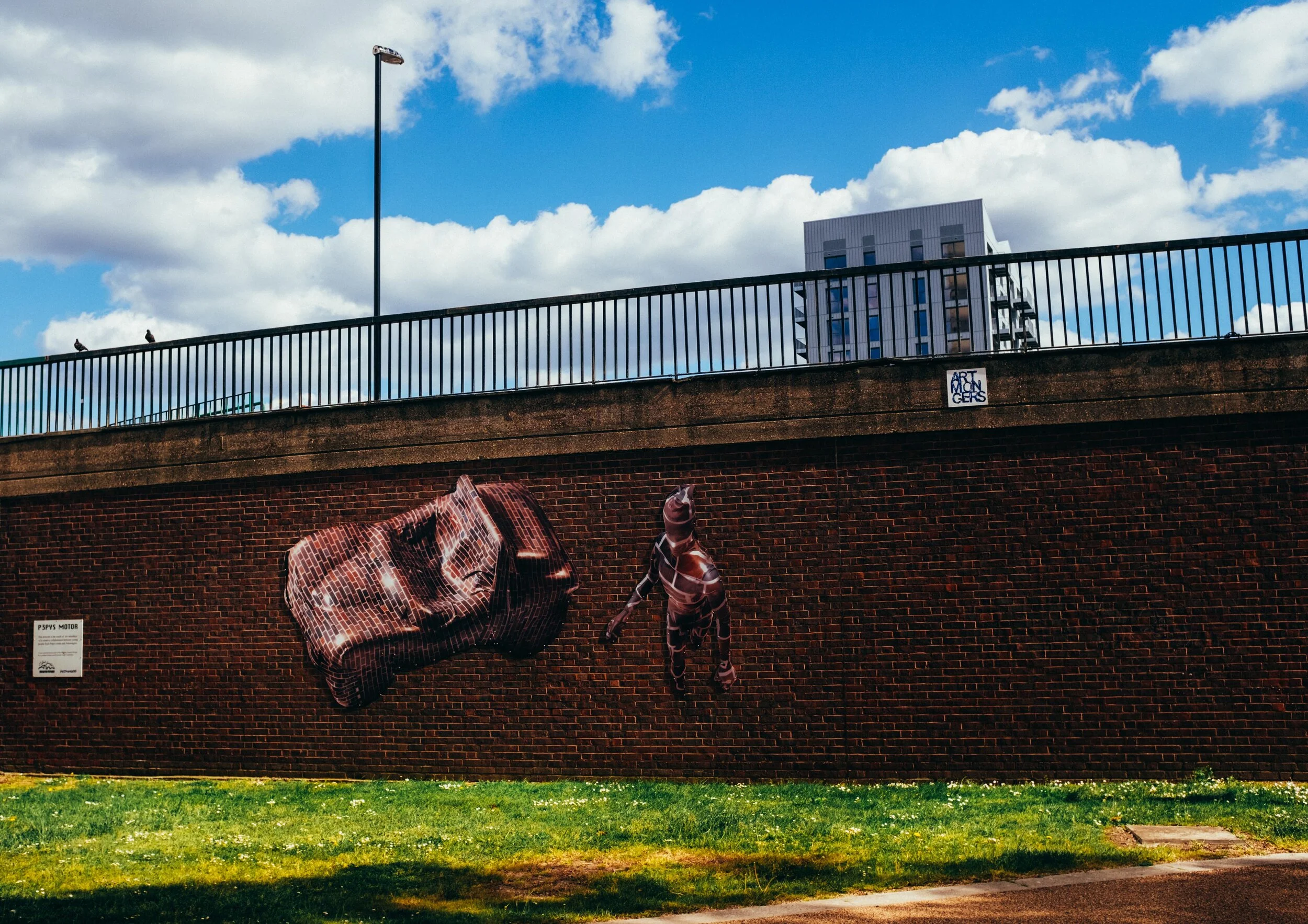 The method of making the image was an interesting journey too. We took a snap of the wall, then created a digital pattern of the bricks, then wrapped a miniature car and doll with a shrunken print, and then photographed them. Lastly we colour-matched the wall again and blew up the print to its larger than life size.