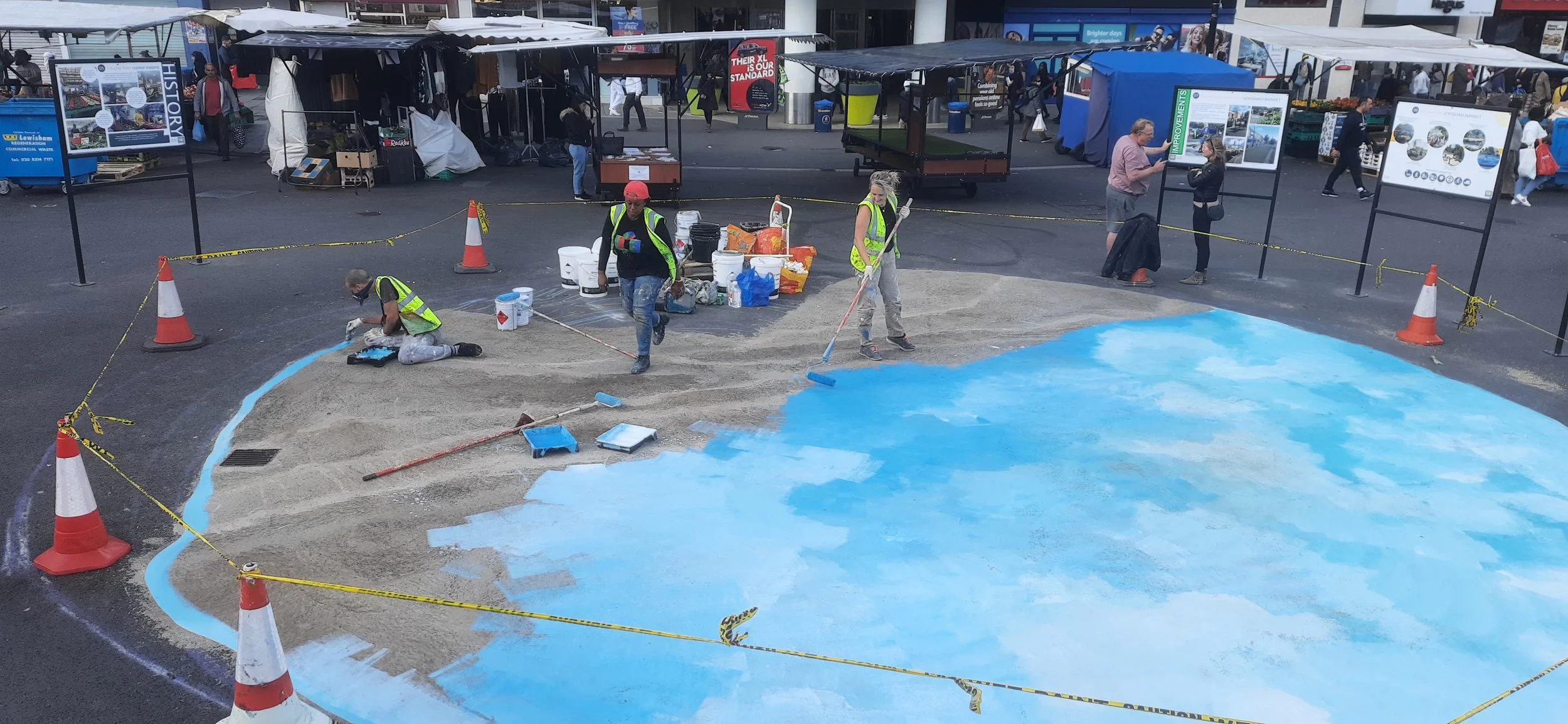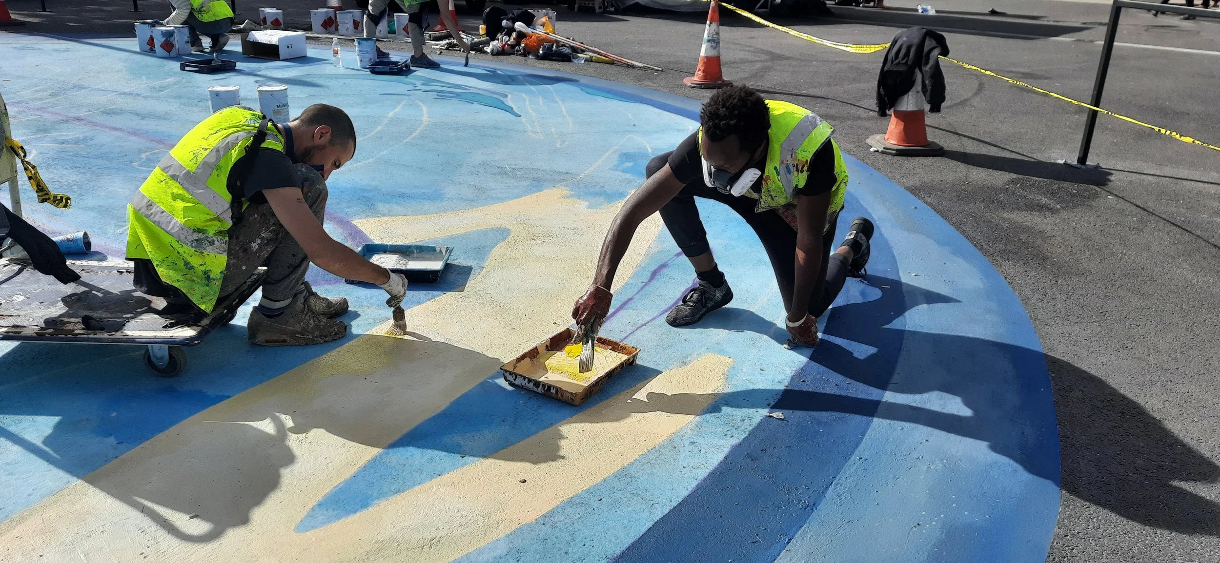 The process of painting straight on the tarmac was interesting. We first used a ‘void filler’, a mix of resin and cement. Getting this layer right was key, as it separated the artwork from the tarmac and gave us a flat canvas on the floor to work with.