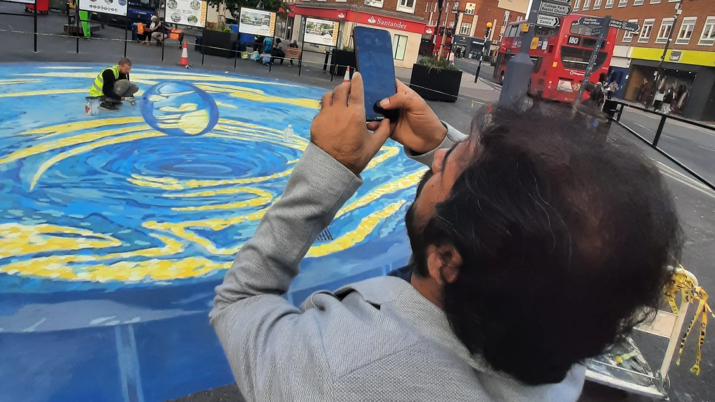 Next, we used an anti-slip paint. The final stage was protecting our artwork with a specialist varnish. As you can see in the image above, free-standing panels have been added to the space by the architects. These were only meant to be there for a couple of weeks, but they frame the piece so well we’ve asked for them to become permanent.