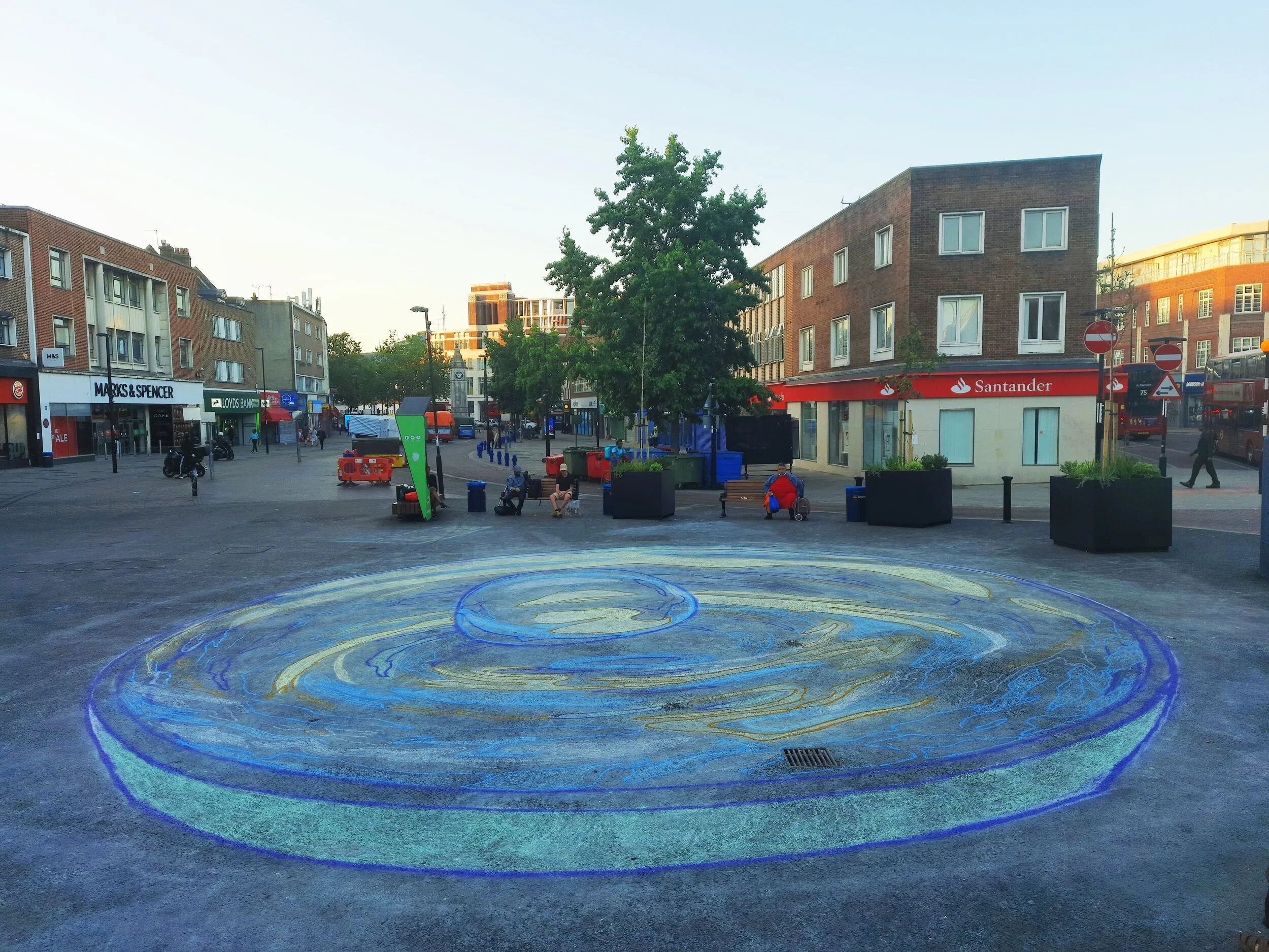 Before committing it to paint, we tested the idea with chalks. The reaction from locals was very positive — perhaps it was the contrast of the fluid shapes and colours against the backdrop of harsh, uniform buildings that did the trick.